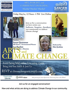 On May 1, 2020, Artists Susan Quateman and Leslie Bartlett were joined by moderator Meri Jenkins in an online conversation on their approaches to climate art and science, working with silk and dyes and photography. This public conversation focused on ways for the community to take action on climate change. It was organized by Gloucester’s Sawyer Free Library and the Gloucester Cultural Initiative. ​
