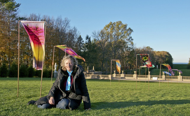 Silk Painting: Climate Change showing sea level rise, engulfing iconic Arthur Fiedler, Boston Pops Conductor, Boston, MA.