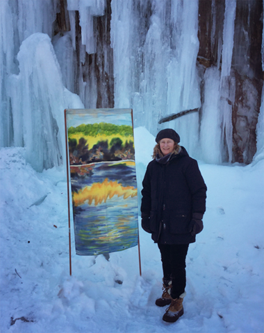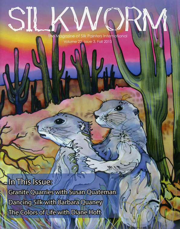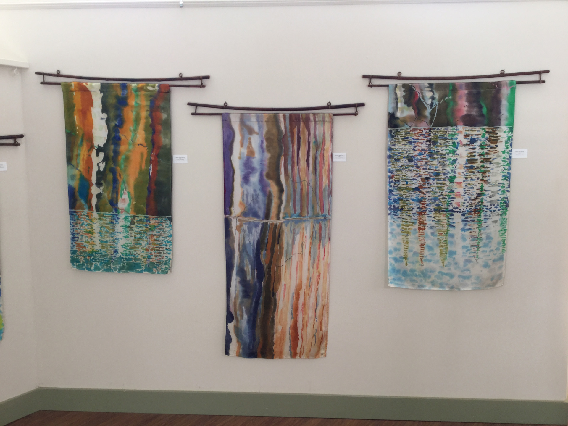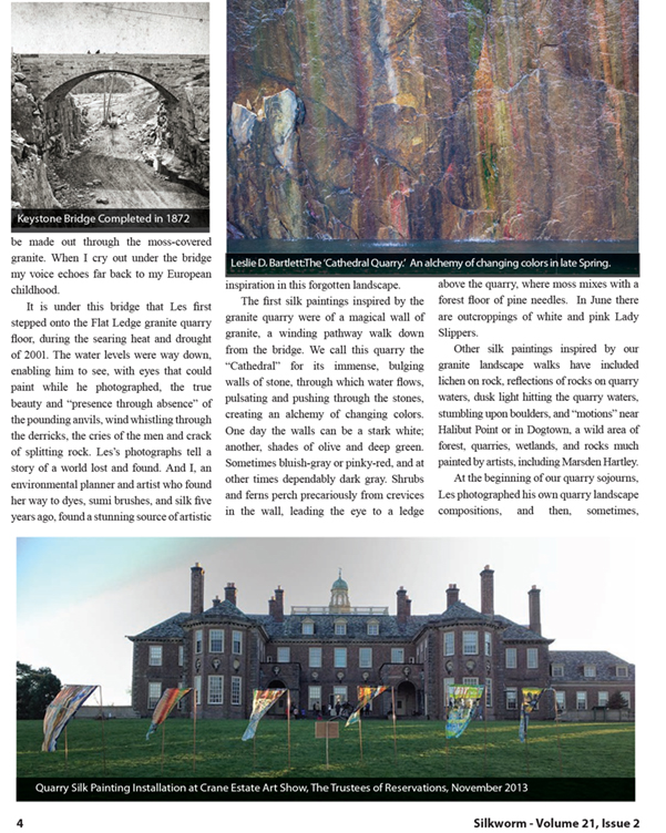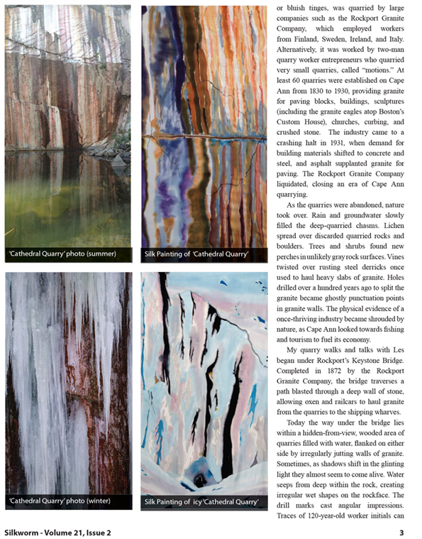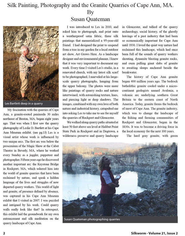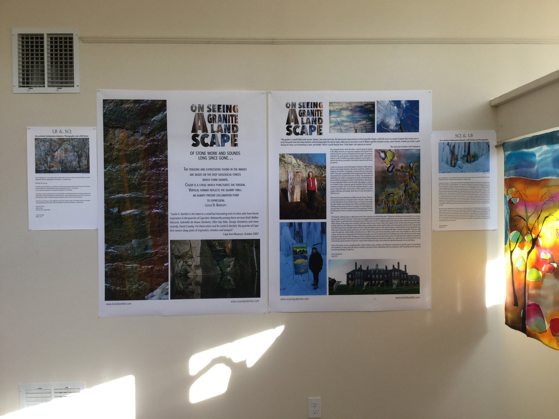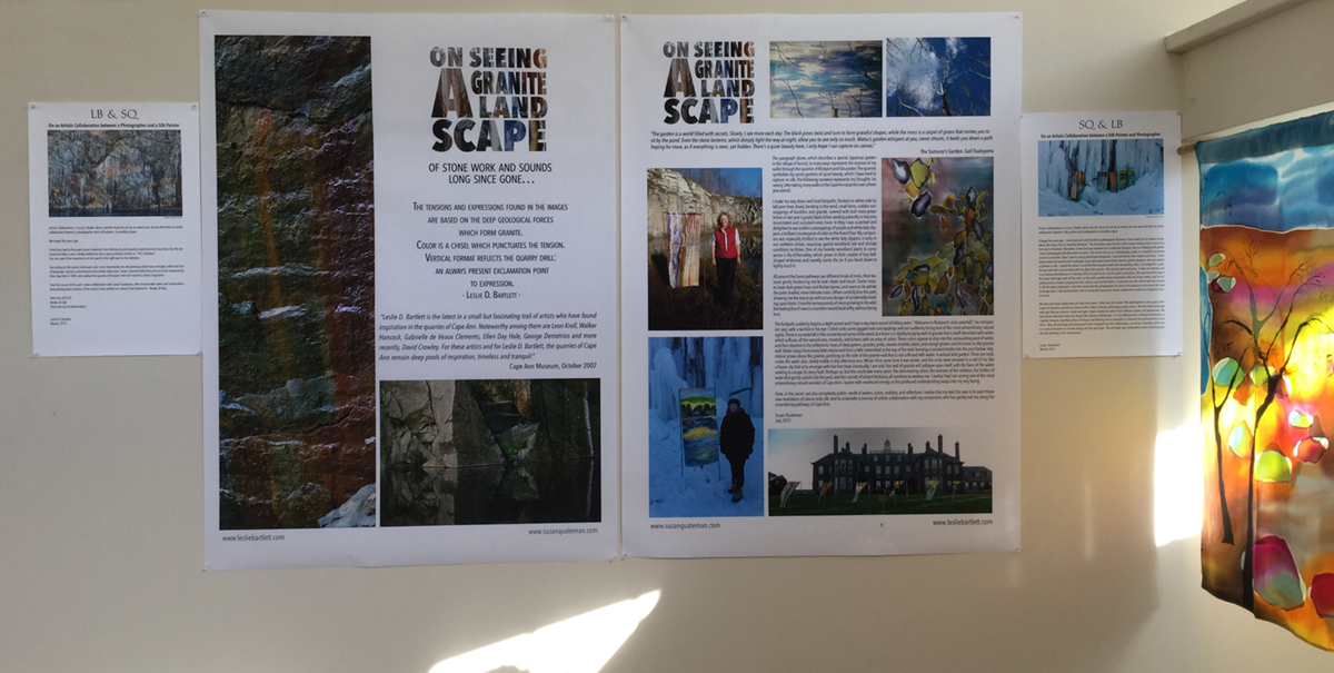A collaboration between Susan Quateman (silk painter) & Leslie D. Bartlett (photographer of quarries), exhibited at Flatrocks Gallery, Gloucester, MA. March 2015