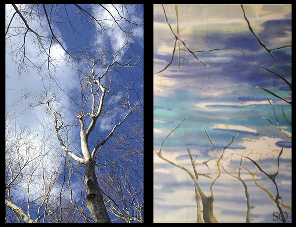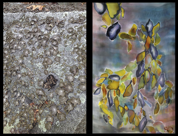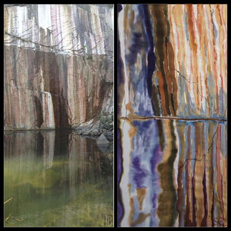 I create silk paintings based on the landscapes of Cape Ann, and most recently, the landscape of my youth in Shrewsbury, UK. I am especially drawn to painting in silk the quarries of Cape Ann, in collaboration with photographer Les Bartlett.